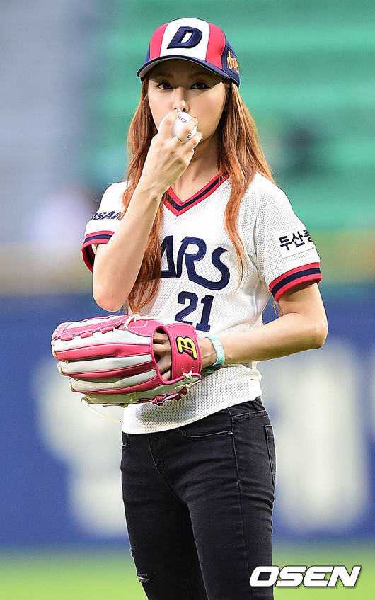 시구자로 나선 걸그룹 카라의 규리가 공에 키스를 하고 있다.