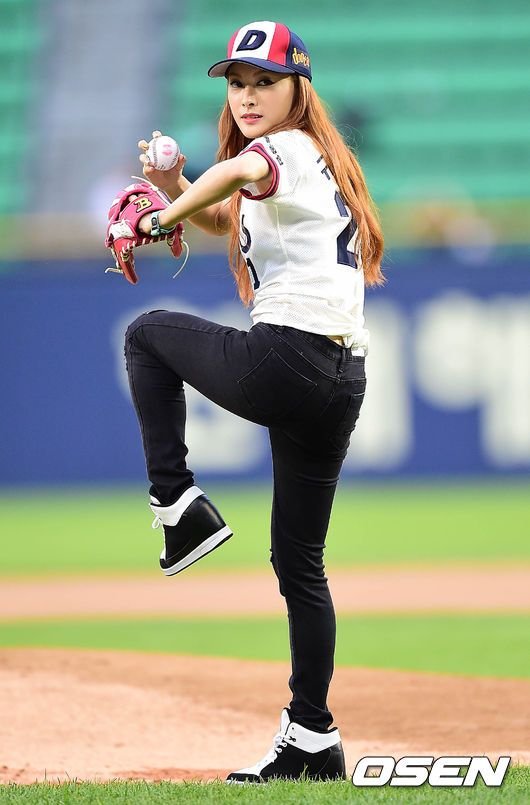 시구자로 나선 걸그룹 카라의 규리가 힘차게 공을 던지고 있다.