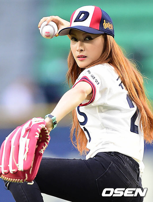 시구자로 나선 걸그룹 카라의 규리가 힘차게 공을 던지고 있다.