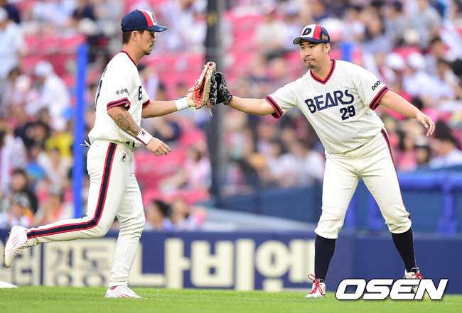 1회초 롯데 공격 1사 1루 상황 손아섭의 땅볼 타구를 병살로 이끈 두산 선발 유희관과 2루수 오재원이 인사를 나누며 더그아웃으로 들어오고 있다.