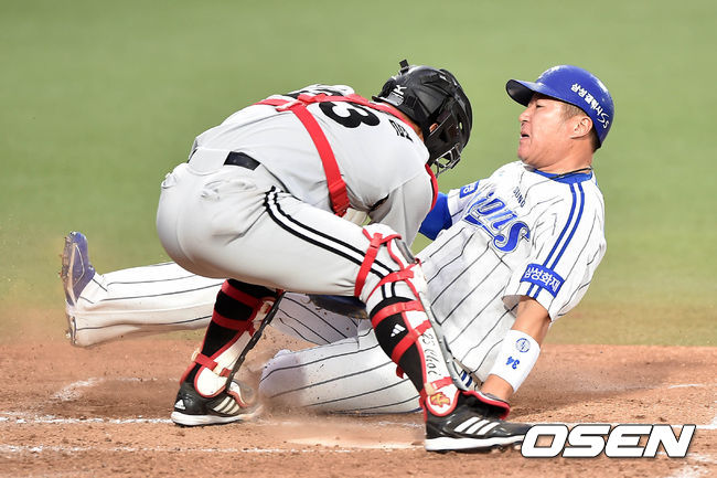 1회말 2사 1,3루에서 LG 신정락 폭투때 홈으로 쇄도한 3루주자 최형우가 포수 최경철에게 태그아웃 당하고 있다.