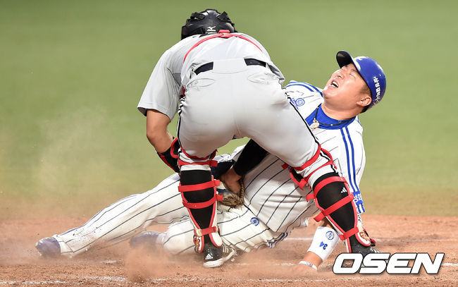 1회말 2사 1,3루에서 LG 신정락 폭투때 홈으로 쇄도한 3루주자 최형우가 포수 최경철에게 태그아웃 당하고 있다.