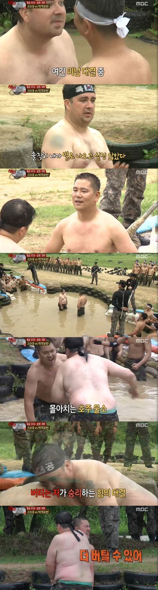 이날 '진짜사나이' 멤버들이 속한 2소대 일원들은 육중한 몸매가 돋보이는 박격포반 대원들과 참호 격투 경기를 벌이게 됐다. 1대1로 나란히 무승부를 거둔 상황, 2소대의 소대장은 마지막 판은 1대1로 해보자고 제안했고, 육중한 몸으로 호주 물소의 힘을 제대로 보여줬던 샘 해밍턴이 2소대의 대표로 나서게 됐다.