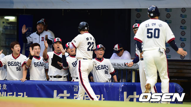 1회말 두산 공격 2사 2, 3루 상황 양의지의 2타점 적시 좌전안타 때 홈을 밟은 김현수와 홍성흔이 송일수 감독을 비롯한 코칭스태프, 더그아웃 동료들과 인사를 나누고 있다.