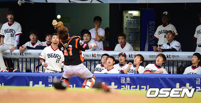 1회초 두산 공격 1사 1, 2루 상황 칸투의 포수 파울플라이 타구를 두산 더그아웃 선수들이 바라보고 있다.
