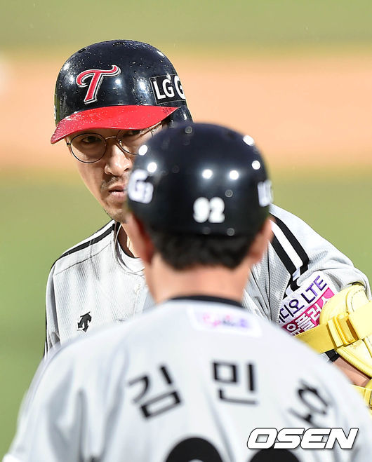 3회초 1사 1,3루에서 LG 정성훈이 우중간을 가르는 적시타를 치고 김민호 코치와 하이파이비를 하고 있다.