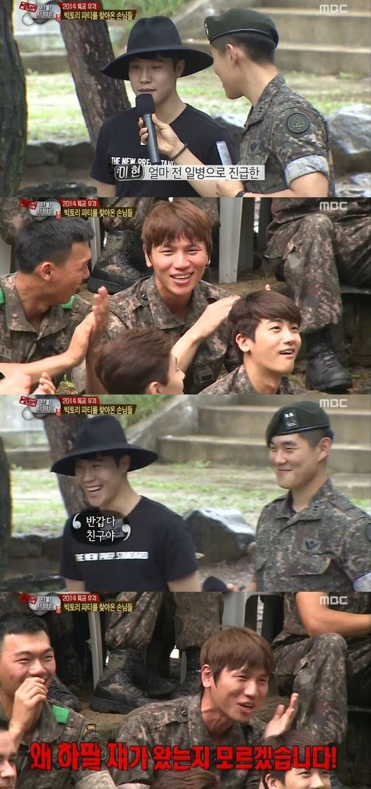 이어 그는 "하고 많은 인맥 중에 네가 왜 왔느냐"고 덧붙여 웃음을 자아냈다. 또 이현은 전역을 한 지 2주 된 사실을 말하며 다른 군인들의 부러움을 사기도 했다.