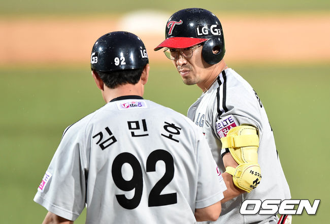 3회초 1사 1,3루에서 LG 정성훈이 우중간을 가르는 적시타를 치고 김민호 코치와 하이파이비를 하고 있다.