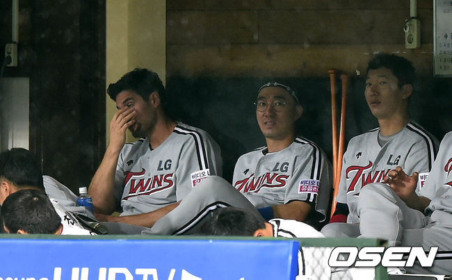3회말 우천으로 인해 경기가 중단되자 LG 선수들이 더그아웃에서 경기를 바라보고 있다.