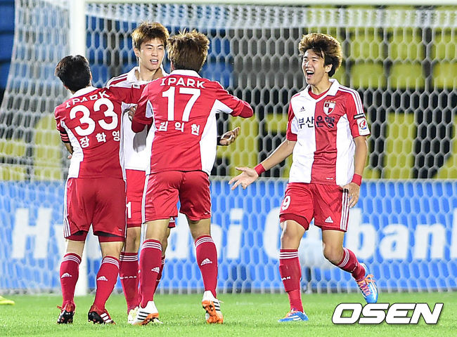 전반 7분 부산 임상협이 선제골을 성공시키고 동료들과 함께 세리머니를 하고 있다.