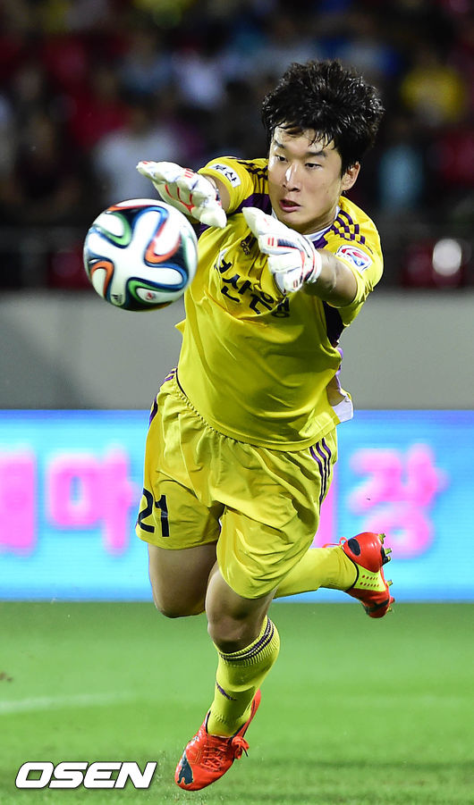 부산 골키퍼 이창근이 몸을 날려 슈팅을 막아내고 있다.