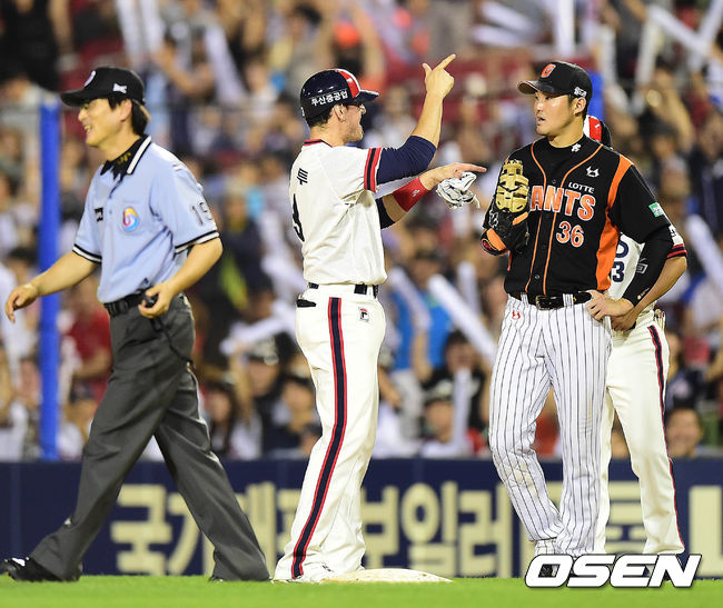 5회말 두산 공격 2사 1, 3루 상황 두산 칸투가 내야 안타를 날리고 1루에서 아웃 판정을 받아 두산 송일수 감독이 합의판정을 요청했다. 판정 결과 아웃에서 세이프로 정정되자 칸투가 환호하고 있다.