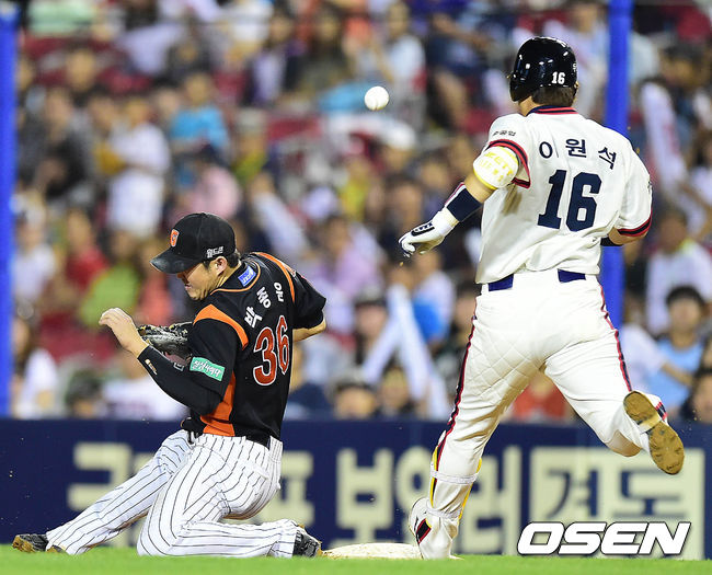6회말 두산 공격 1사 주자없는 상황 이원석의 내야안타 때 롯데 1루수 박종윤이 3루수 황재균의 악송구를 놓치고 있다.