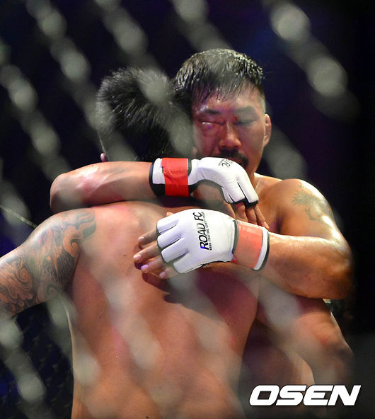 17일 밤 서울 올림픽공원 올림픽 홀에서 벌어진 ‘로드FC 017’ 김대성-박정교가 경기를 마치고 포옹을 하고 있다.