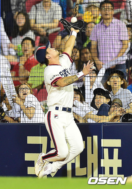 8회초 롯데 공격 1사 2루 상황 황재균의 파울 타구를 두산 2루수 오재원이 끝까지 따라가 잡으려 했지만 아쉽게 놓치고 있다.