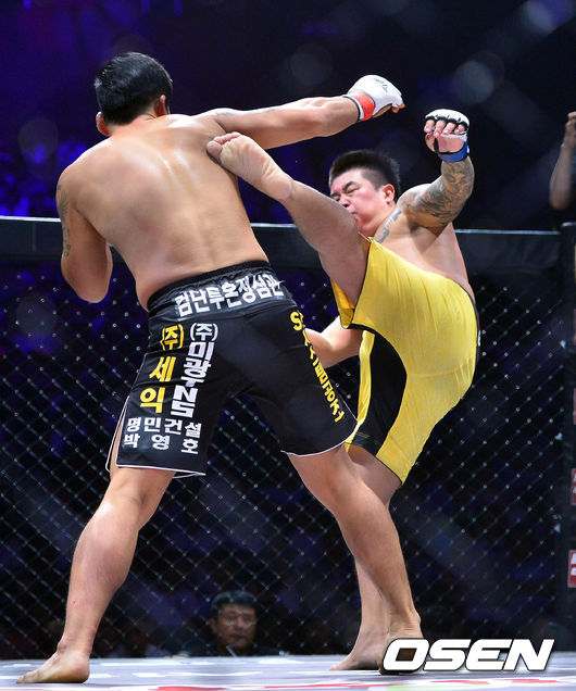 17일 밤 서울 올림픽공원 올림픽 홀에서 벌어진 ‘로드FC 017’ 김대성이 박정교에 하이킥 공격을 하고 있다.