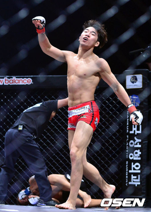 17일 밤 서울 올림픽공원 올림픽 홀에서 벌어진 ‘로드FC 017’ 이윤준-티아고 실바 경기에서 이윤준이 티아고 실바를 레프리스탑 TKO로 물리치고 환호하고 있다.
