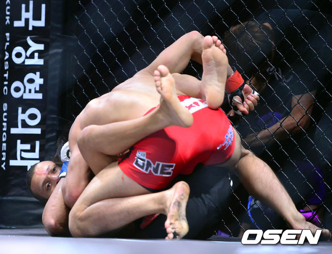 17일 밤 서울 올림픽공원 올림픽 홀에서 벌어진 ‘로드FC 017’ 이윤준-티아고 실바 경기에서 이윤준이 티아고 실바를 레프리스탑 TKO로 물리치고 있다.
