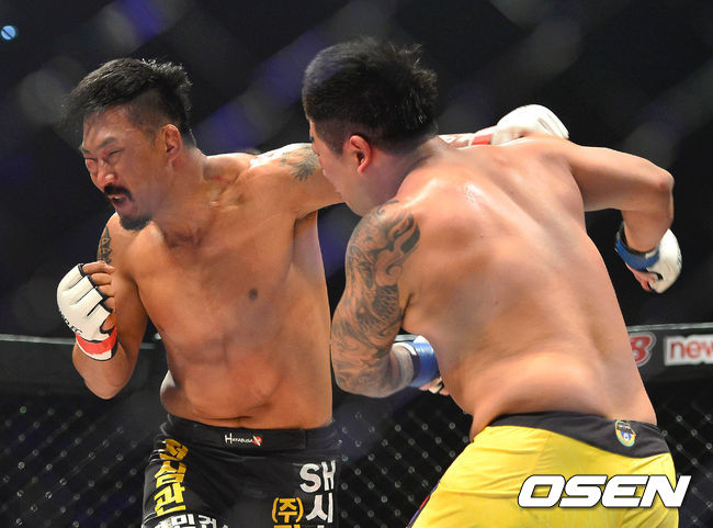 17일 밤 서울 올림픽공원 올림픽 홀에서 벌어진 ‘로드FC 017’ 박정교-김대성이 불꽃튀는 난타전을 벌이고 있다. 박정교가 TKO 승을 거두었다.