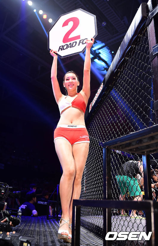17일 밤 서울 올림픽공원 올림픽 홀에서 벌어진 ‘로드FC 017’ 이윤준-티아고 실바 경기에서 로드걸 박진아가 라운드를 알리고 있다.