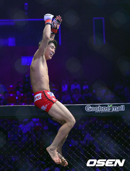 17일 밤 서울 올림픽공원 올림픽 홀에서 벌어진 ‘로드FC 017’ 이윤준-티아고 실바 경기에서 이윤준이 티아고 실바를 레프리스탑 TKO로 물리치고 환호하고 있다.