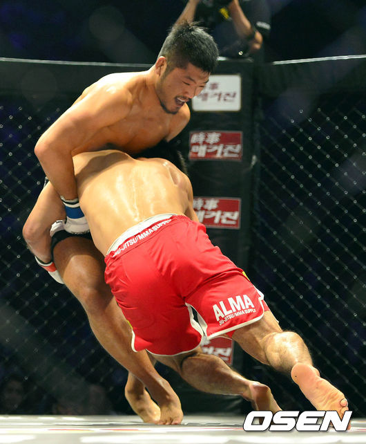 17일 밤 서울 올림픽공원 올림픽 홀에서 벌어진 ‘로드FC 017’ 권아솔-쿠메 다카스케 경기서 권아솔이 쿠메의 테이크다운 공격을 방어하고 있다. 권아솔이 판정승을 거두었다.