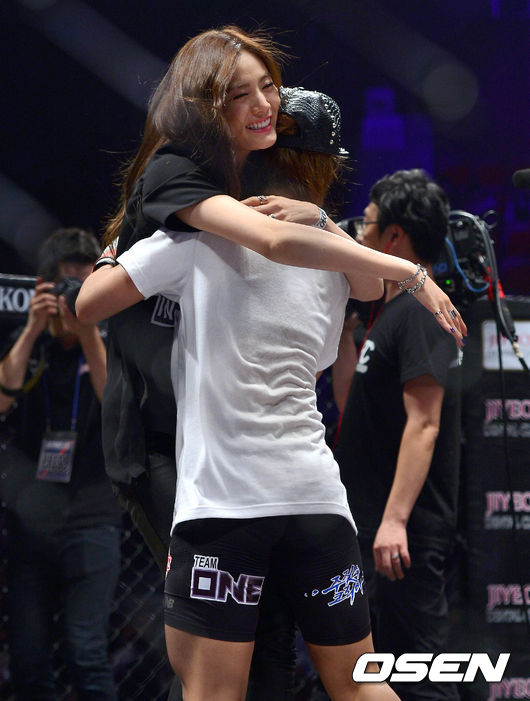 17일 밤 서울 올림픽공원 올림픽 홀에서 벌어진 ‘로드FC 017’ 송가연-에미 야마모토 경기, 송가연이 승리를 거둔 후 애프터스쿨 나나와 포옹을 나누고 있다.