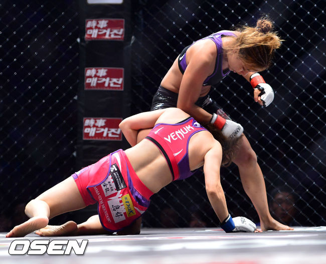 17일 밤 서울 올림픽공원 올림픽 홀에서 벌어진 ‘로드FC 017’ 송가연-에미 야마모토 경기, 송가연이 에미 야마모토를 공격하고 있다.