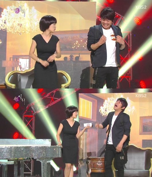 김지민이 김대희에게 "넌 모차르트랑 베토벤 둘 중에 누가 더 좋아?"라고 하자 김대희는 "너무 어려워요. 이건 마치 강수지냐 하수빈이냐 같은 질문이야"라고 답했다. 이에 김지민은 "뭐지? 뮤직뱅크가 아니라 가요무대 볼 것 같애"라고 말해 웃음을 자아냈다.