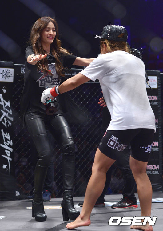 17일 밤 서울 올림픽공원 올림픽 홀에서 벌어진 ‘로드FC 017’ 송가연-에미 야마모토 경기, 송가연이 승리하자 애프터스쿨 나나가 링에 올라 축하해주고 있다.