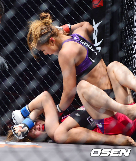 17일 밤 서울 올림픽공원 올림픽 홀에서 벌어진 ‘로드FC 017’ 송가연-에미 야마모토 경기, 송가연이 에미를 파운딩 공격하고 있다. 레프리스탑 TKO 승을 거두었다.