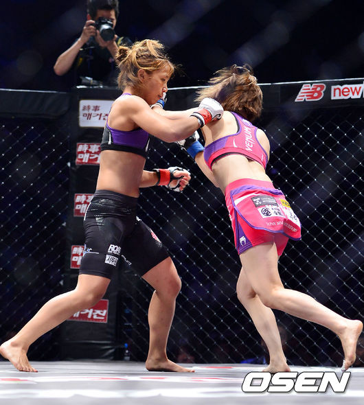 17일 밤 서울 올림픽공원 올림픽 홀에서 벌어진 ‘로드FC 017’ 송가연-에미 야마모토 경기, 송가연이 라이트훅을 날리고 있다. 송가연이 레프리스탑 TKO 승을 거두었다.