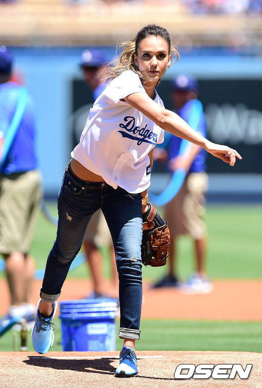 경기에 앞서 제시카 알바가 시구를 하고 있다.