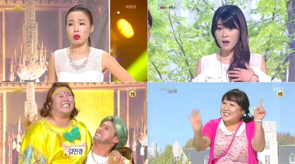 지난 17일 오후 방송된 '개그콘서트'에서도 역시 이런 모습이 비춰졌다. '억수르' 코너에서 오나미는 개성 넘치는 외모를 주요 무기로 내세웠다. 아버지 역할의 송준근은 딸 오나미의 볼뽀뽀에 경약하고, 김기열은 "결혼하자"고 말하는 오나미를 냉정하게 거절했다. 이어 등장한 김민경은 다소 큰 몸을 송준근에게 기댔고, 송준근은 힘들어하는 기색을 그대로 드러냈다.