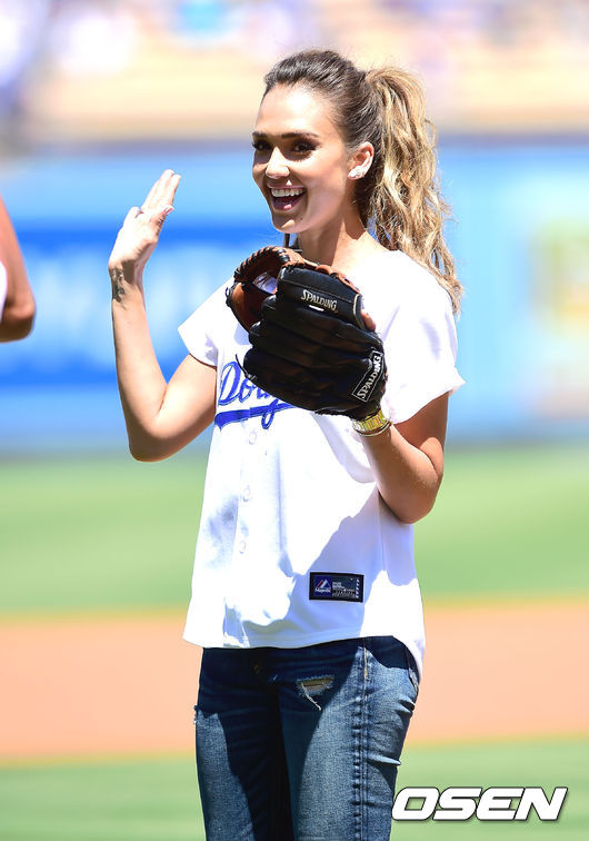 18일(한국시간) 미국 캘리포니아주 로스앤젤레스 다저스타디움에서 '2014 메이저리그' LA 다저스와 밀워키 브루어스의 경기 전 제시카 알바가 시구를 해 화제가 됐다.