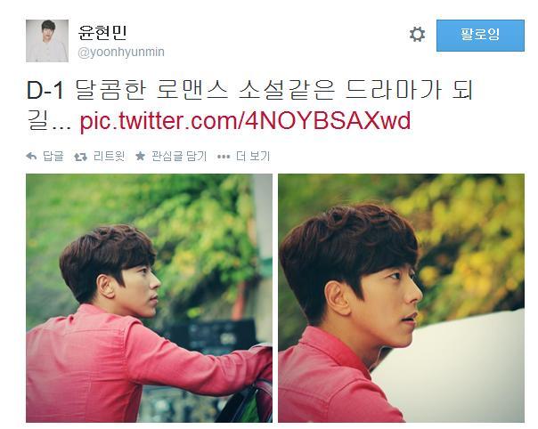 윤현민은 지난 17일 오후 자신의 트위터를 통해 “D-1 달콤한 로맨스 소설 같은 드라마가 되길”이라는 글과 함께 조각 같은 옆모습이 인상적인 사진 두 장을 게재했다.