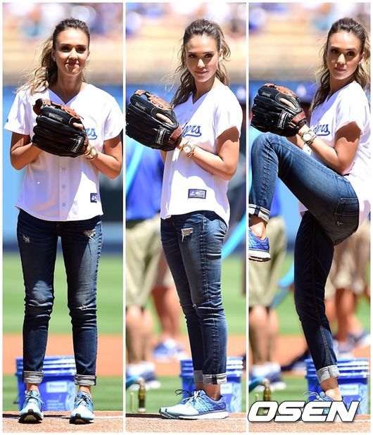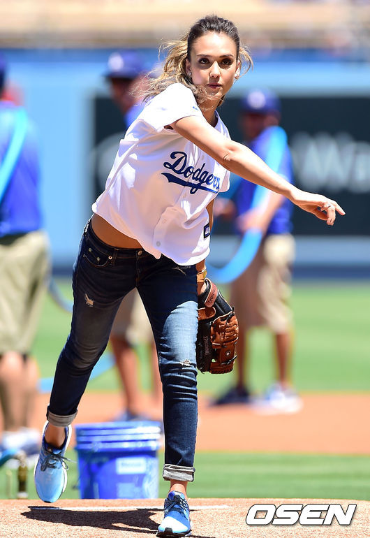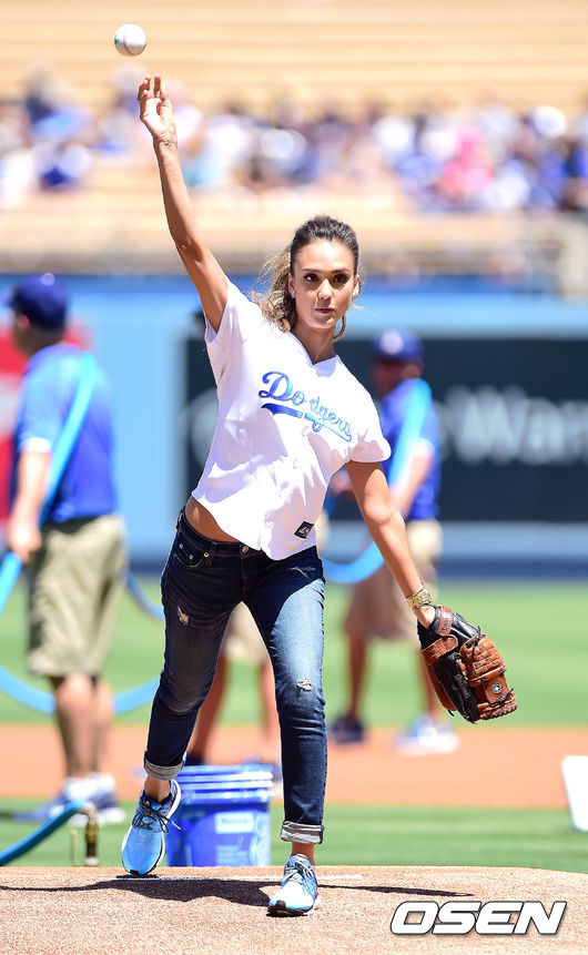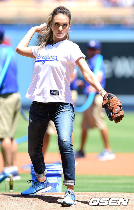 할리우드 여배우 제시카 알바가 LA 다저스 홈경기 시구자로 나섰다.