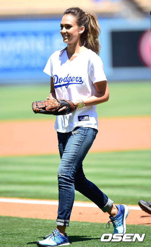 제시카 알바는 18일(한국시간) 미국 캘리포니아주 로스앤젤레스 다저스타디움에서 열린 '2014 메이저리그' LA 다저스와 밀워키 브루어스의 경기에서 다저스 유니폼을 입고 시구를 했다.