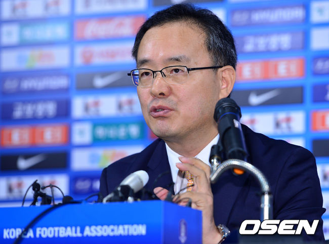 18일 오전 서울 종로구 축구회관에서 열린 판 마르바이크 감독 계약 협상 결렬 관련 기자회견에서 이용수 대한축구협회 기술위원장이 질문에 답을 하고 있다.