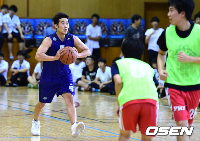 18일 오후 전북 전주시 전일고등학교에서 열린 'Kappa와 KCC 농구단이 함께하는 학교 폭력 추방 캠페인' 행사에서 정의한이 학생들과 농구 클리닉 시간을 갖고 있다.