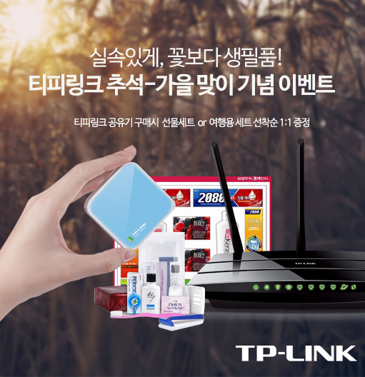 또한 보급형 무선 N 공유기 TL-WR940N, TL-WR847N, TL-747 및 휴대용 미니 공유기 TL-WR702N을 구매하는 500명에게는 귀경 및 가을 단풍놀이 시 유용한 여행용 세트를 제공한다.