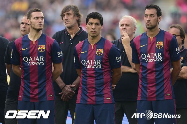 경기 시작 전 수아레스가 '이적생 동료' 토마스 베르마엘렌(왼쪽), 세르히오 부스케츠와 함께 서있다.