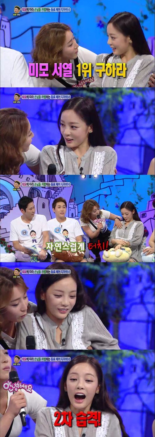 카라 멤버 구하라가 ‘안녕하세요’에 출연해 자신의 가슴 부위를 만진 여성 헤어디자이너의 돌발 행동에 기겁했다.