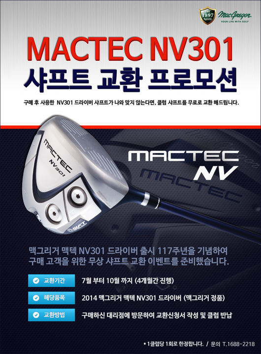 맥텍 NV301 드라이버를 구매해 사용한 뒤 구매한 제품의 스펙이 맞지 않으면 샤프트를 무상 교환해준다. 고객 1인당 1회 교환할 수 있으며, 구매한 매장을 방문해 교환신청서를 작성한 후 제품을 반납하면 된다. 반납 후 일주일 이내로 교환된 제품을 받아볼 수 있으며 대상 품목은 맥텍 NV301 드라이버에 한한다.