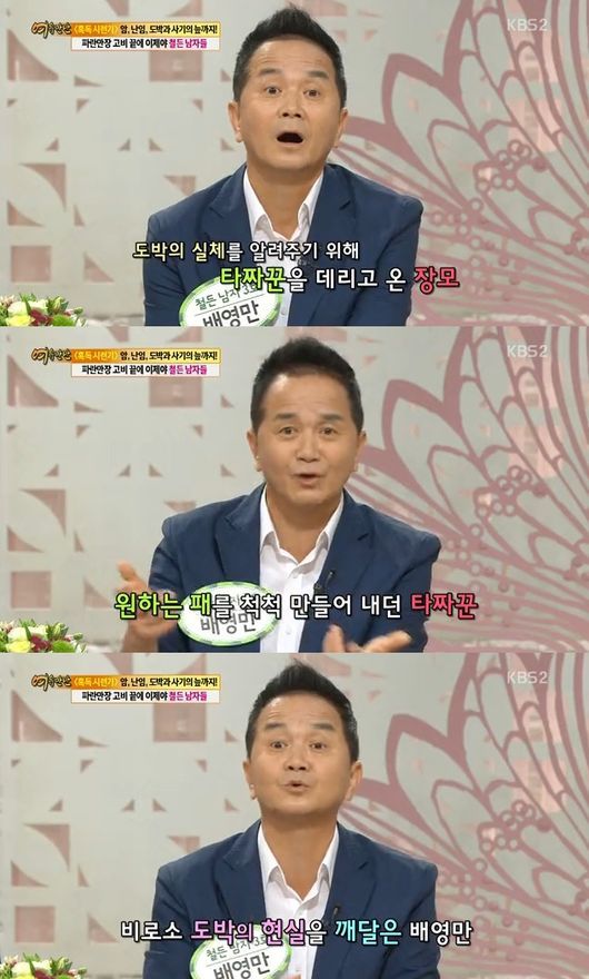 배영만은 19일 방송된 KBS 2TV ‘여유만만’에서 “내가 도박을 너무 좋아하니까 장모님이 진짜 타짜를 데리고 왔더라. 그때 도박이 사기였구나라는 걸 알았다”라고 말문을 열었다.