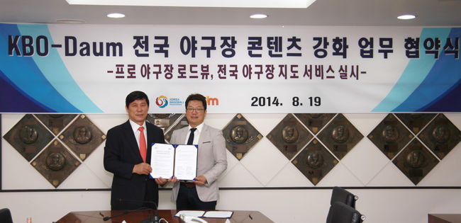 KBO(총재 구본능)와 Daum(대표이사 최세훈)은 19일 오전 11시 도곡동 야구회관 5층 회의실에서 KBO 야구발전실행위원회 허구연 위원장과 Daum 배성준 제휴마케팅 본부장이 참석한 가운데 '전국 야구장 콘텐츠 강화를 위한 업무 협약'을 체결했다.