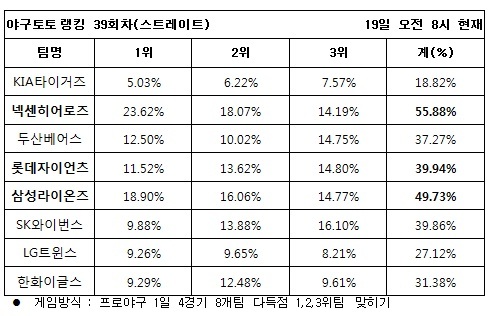 국민체육진흥공단(www.kspo.or.kr)이 발행하는 체육진흥투표권 수탁사업자인 스포츠토토 공식발매사이트인 베트맨(www.betman.co.kr)은 20일에 벌어지는 롯데-한화, 넥센-LG, SK-두산, KIA-삼성전 등 4경기 8개팀을 대상으로 한 야구토토 랭킹 39회차 스트레이트 게임 중간집계결과 넥센(55.88%), 삼성(49.73%), 롯데(39.94%)가 다득점 상위 3개팀으로 꼽혔다고 밝혔다. 반면 KIA와 LG는 각각 18.82%와 27.12%를 득표해 가장 적은 득점을 기록할 것으로 예상했다.