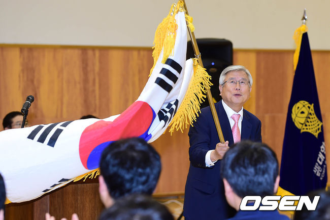 19일 오후 충북 진천군 진천선수촌에서 열린 2014 FIBA 농구월드컵 국가대표 선수단 결단식에서 이경호 대표팀 단장이 단기를 흔들고 있다.