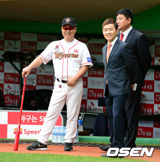 19일 오후 인천 문학야구장에서 열린 '2014 한국야쿠르트 세븐 프로야구' SK 와이번스와 두산 베어스의 경기, 경기에 앞서 SK 이만수 감독이 양준혁 해설위원과 이야기를 나누며 미소짓고 있다.
