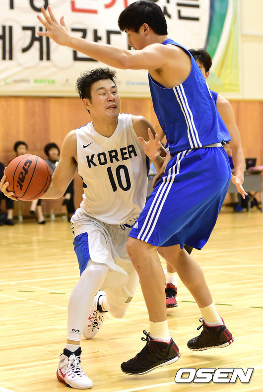 19일 오후 충북 진천군 진천선수촌에서 열린 남자농구대표팀과 서울 삼성의 경기, 조성민이 골밑 돌파를 시도하고 있다.